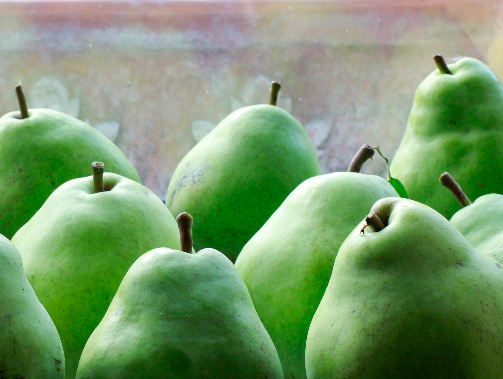 Pick the pears before they fall and let them ripen for a week or two behind a window. From hard and tasteless, the eating pears below became juicy and sweet.