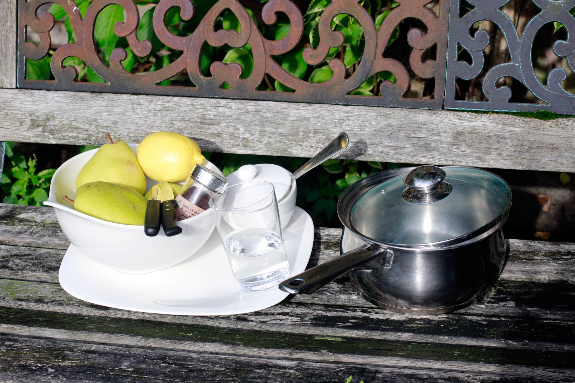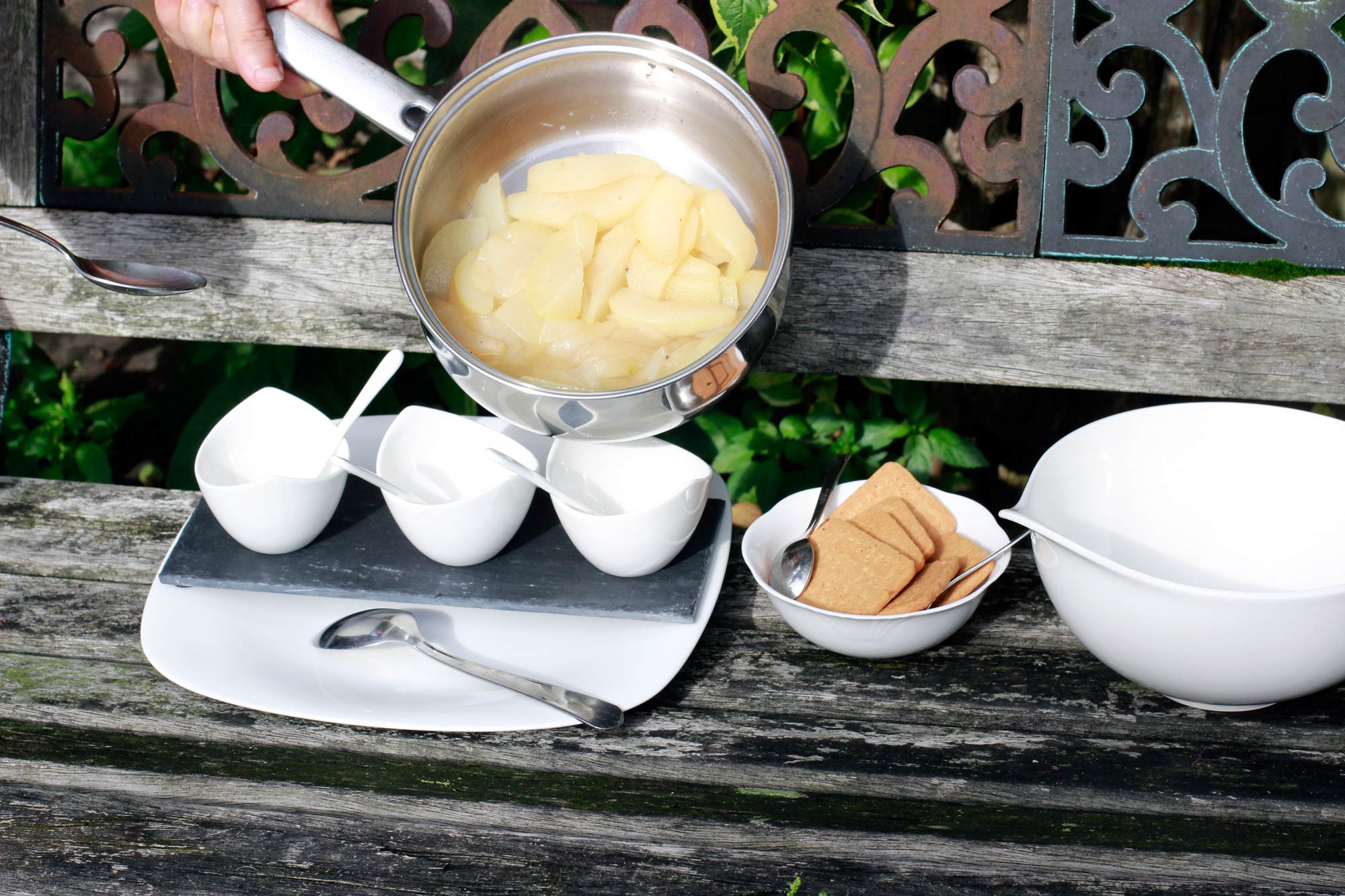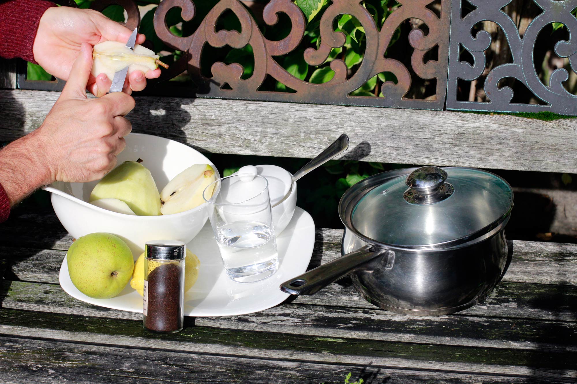 Stewed sliced pears can be as easy and quick to make as a compote. It took fifteen minutes to peel, cut, flavour and cook these particularly easy to process pears from Southfields, and five minutes to dress these three cups: