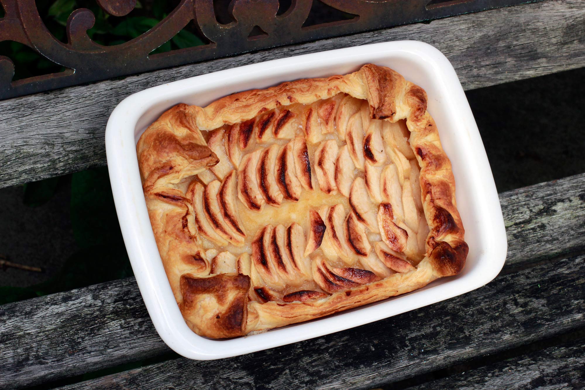 I only had the option to buy puff pastry, in this small supermarket opened early Sunday morning, four hundred meters away from our home. And when I got back I realised that yes it was ready-rolled, but it was of a rectangular shape. Maybe “sheet” in “Puff Sheet” means that it is rectangular indeed, but I didn’t catch that. In France the standard ready-rolled pastry is round. Whatever, I would have bought it anyway, I was ready to change my cooking habits all the way.