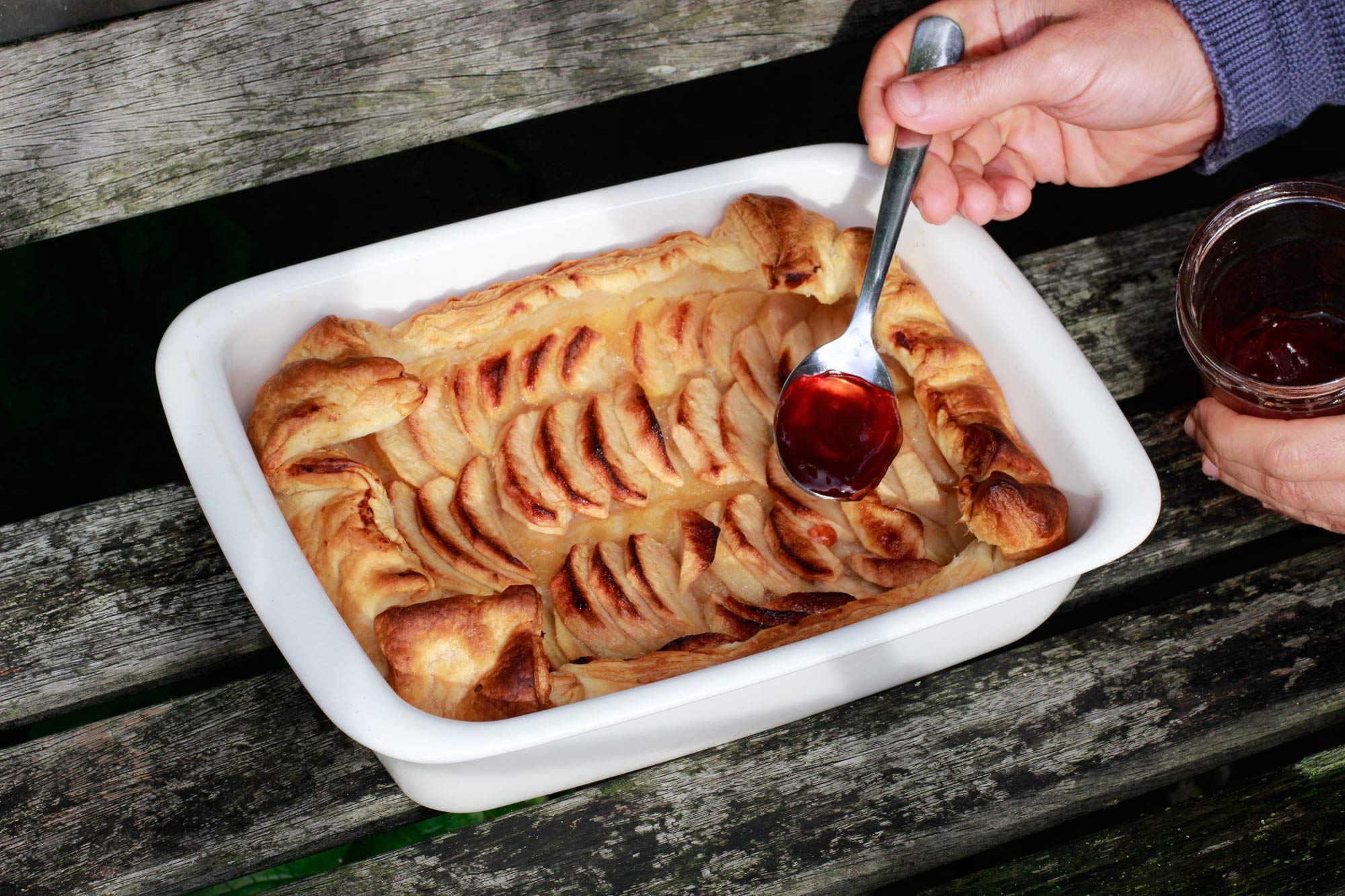 Added the finishing touch: three spoons of quince glazing, the taste of which goes very well with the apple tart.