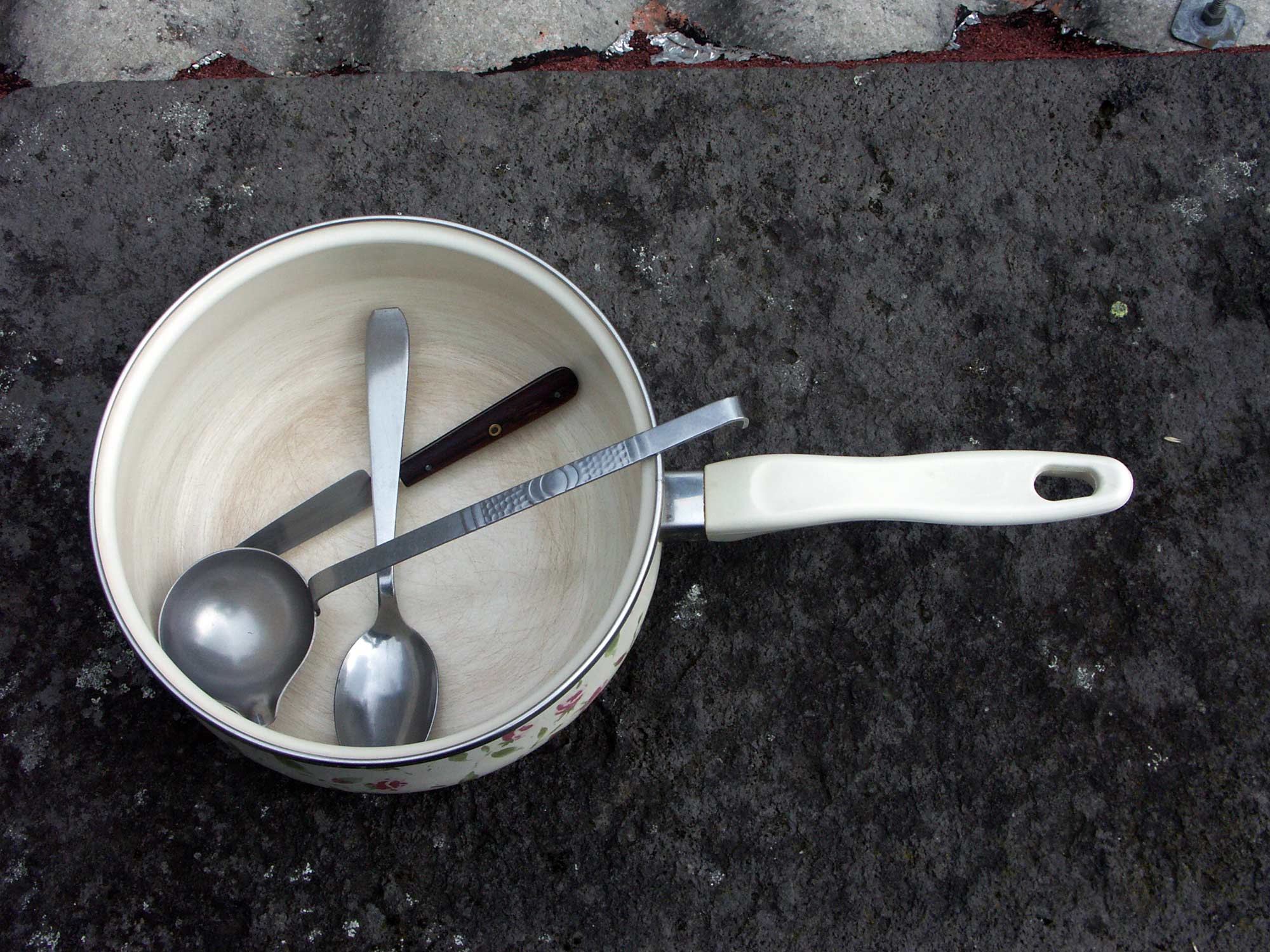 Kitchen essentials: a knife, a saucepan, a large spoon or a spatula, and a ladle.