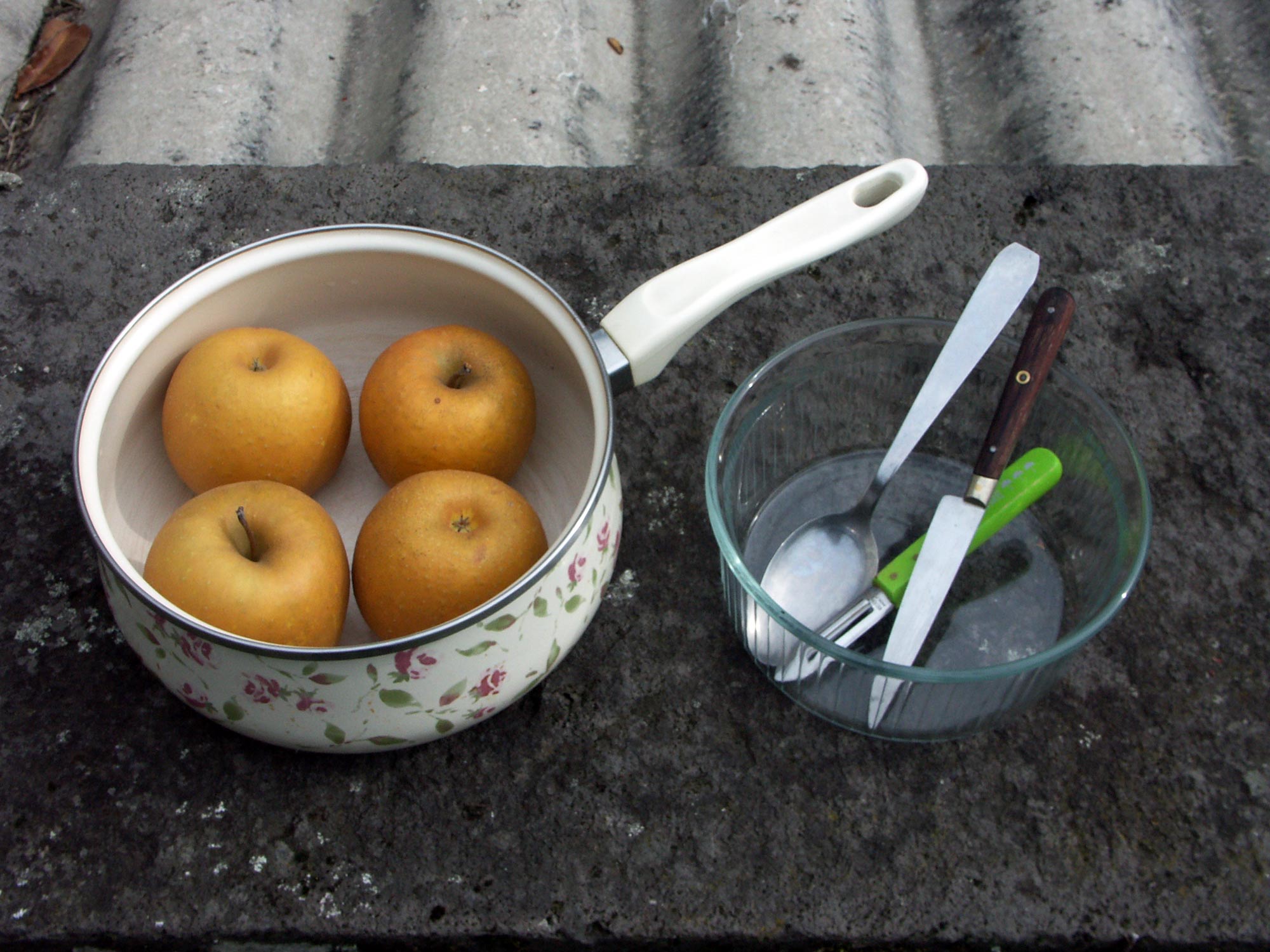 Kitchen essentials: a knife, a peeler (the knife would do), a saucepan and a spoon.