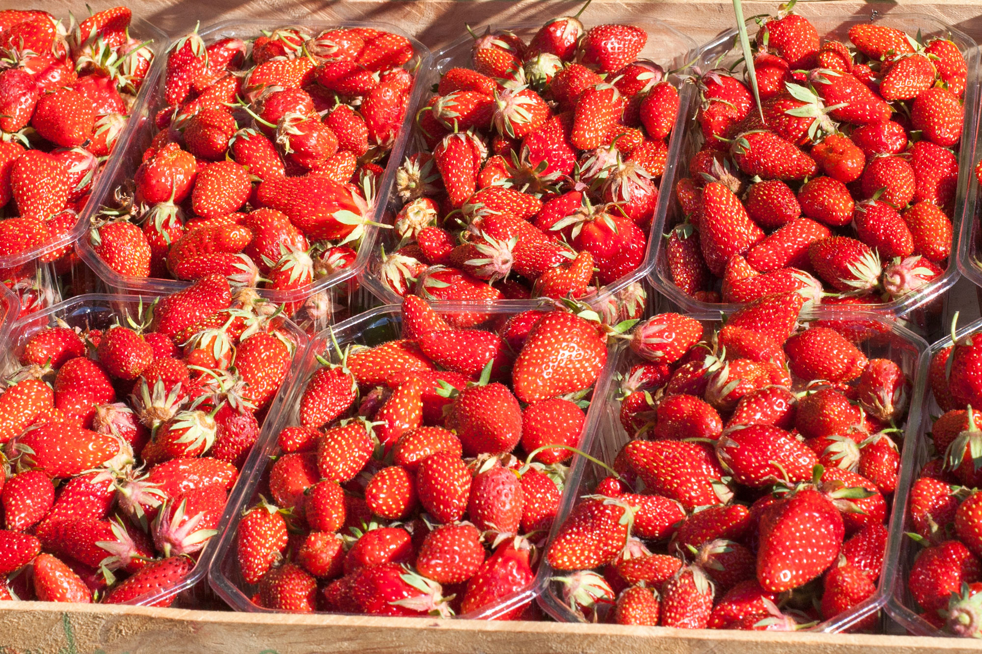 With ten 500g boxes of strawberries, we would make around 20 x 375g jars (= standard Bonne Maman jar). Photo 21 May, Aurillac, France.