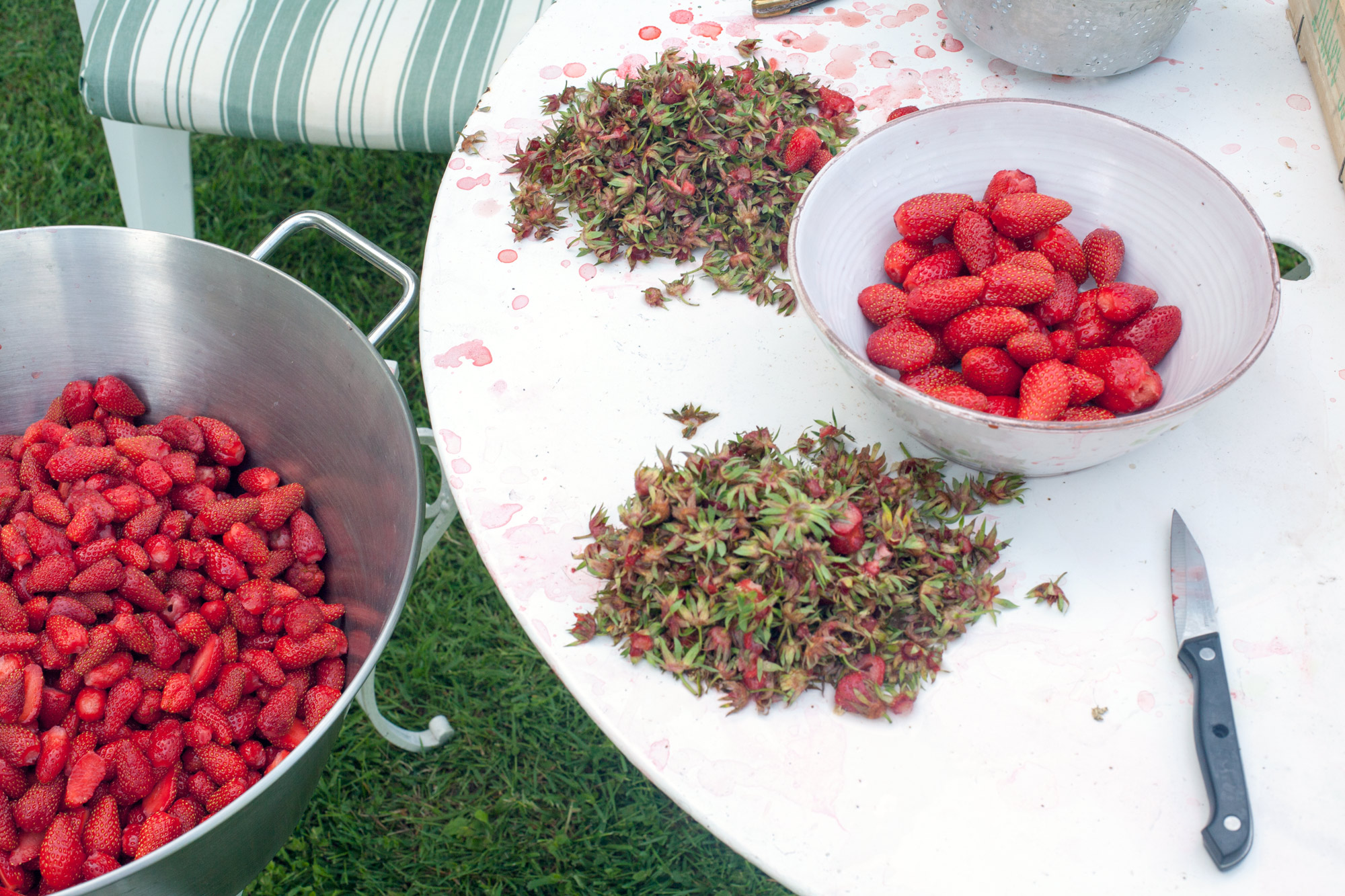 You can also avoid slicing the strawberries: once in the jam pan, crush them with a potato masher and the sugar. It won’t take more than two minutes even for 5kg of strawberries and 3.5kg of sugar!