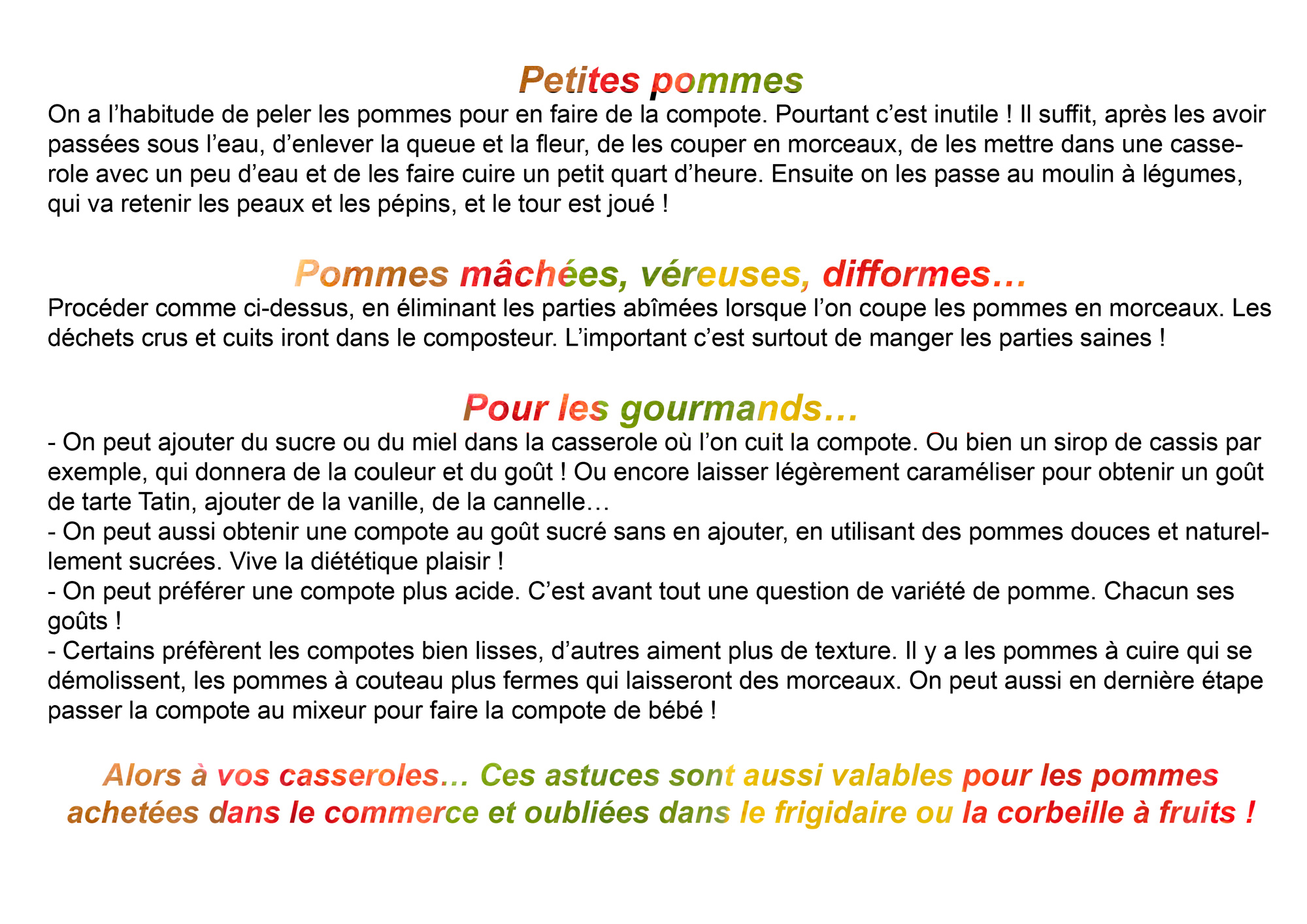 Reality… Free of any chemical treatment, these apples enable compote makers to use the skins full of vitamins and minerals. Some are lost during cooking and when passing the compote through the sieve, but less than if the apples were peeled beforehand. Picture taken in the orchard where we collected the windfalls for the compote workshop. 5 October, La Plantelière, Aurillac, France.