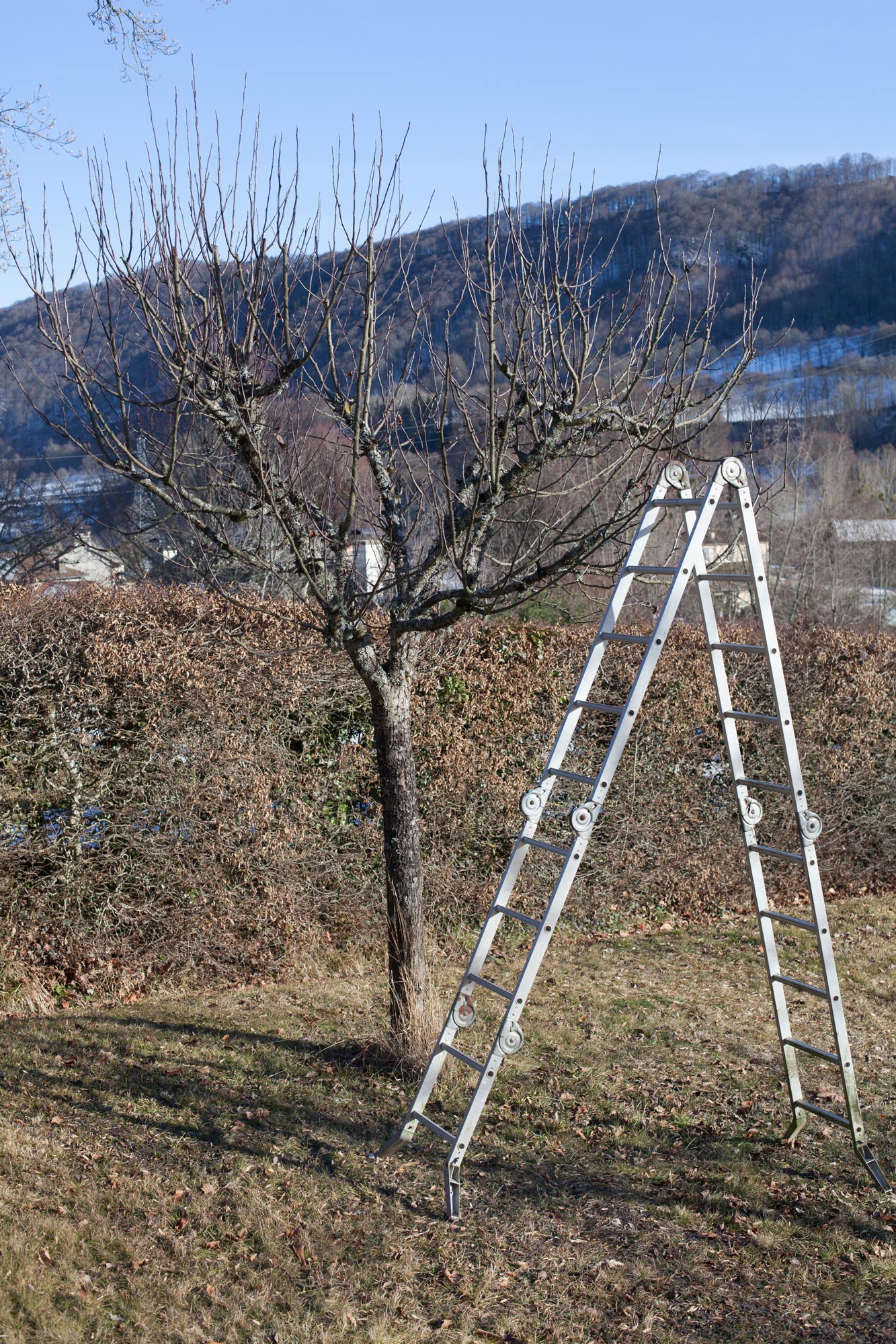 It was partly due to the height of the second tree. Cutting high branches from it, on the ladder or standing in the tree was not that easy even with the right tool, a light long-handled pruning shear that can be used with just one hand.