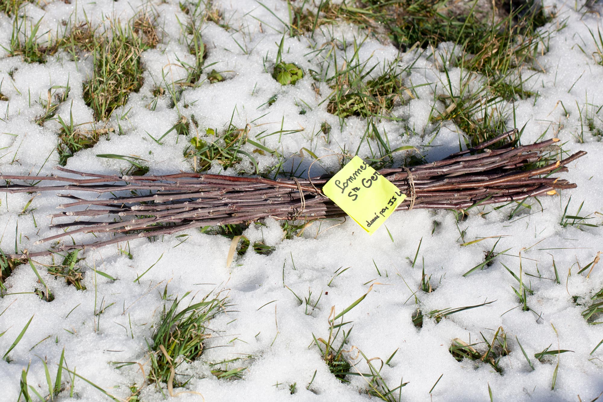The scions were tied and labelled with the name of the cultivar, ‘Sainte Germaine’, which I had identified in 2015 by looking at the fruit, tasting it and comparing with apples of the same name I found on the local market. I was confident I was right. I donated the scions yesterday. They will be kept for two months in a cool place by the ‘Croqueurs de Pommes’, before being offered to the community of its members for exchange.