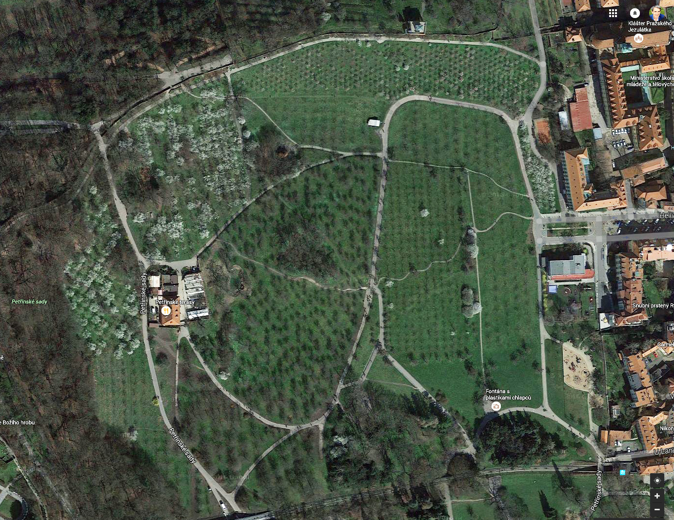 Mapping in spring might help. Two thousand fruit trees starting to blossom in a public orchard on Petrin Hill, central Prague, Czech Republic. Screenshot 10 July 2016, source Google maps. For more information on Prague’s orchards, read our article ‘Blossoming in the public spaces of Prague‘.