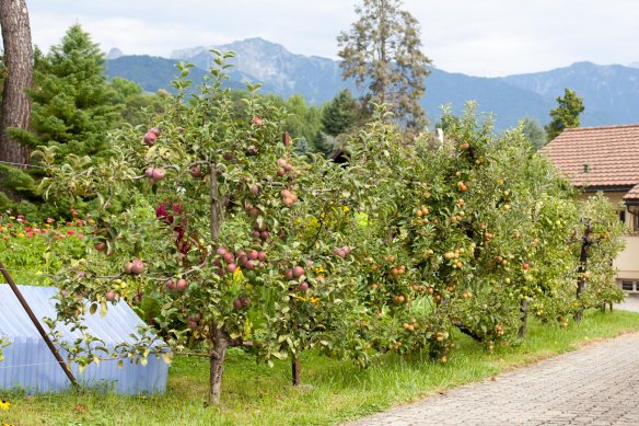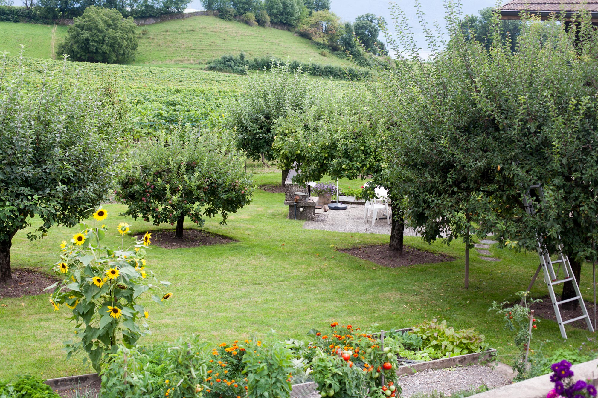 The tidy garden. Its owner had just finished harvesting plums from the tree on the right-hand side. The two apples trees in the middle are full of apples (click on photo to zoom in). Photo 15 August, Vevey, Switzerland.