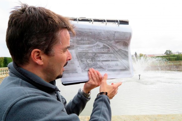 Our guide detailing the Kroměříž orchard renovation project plan, using a 1691 lithography of the place. We are in the top right square of the garden. Photo Karl Strasser, 7 October 2017.