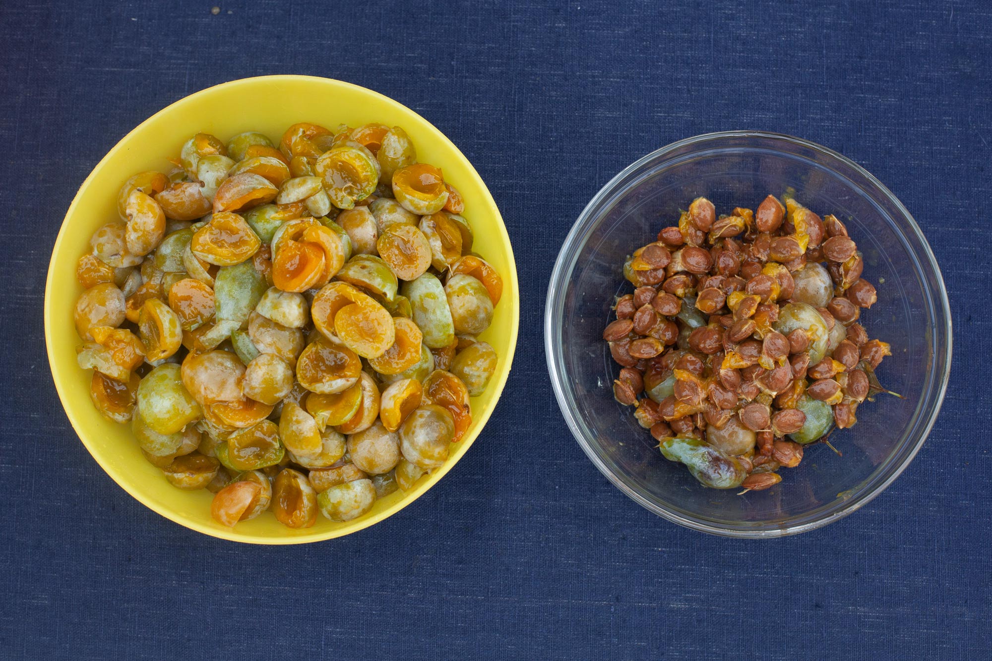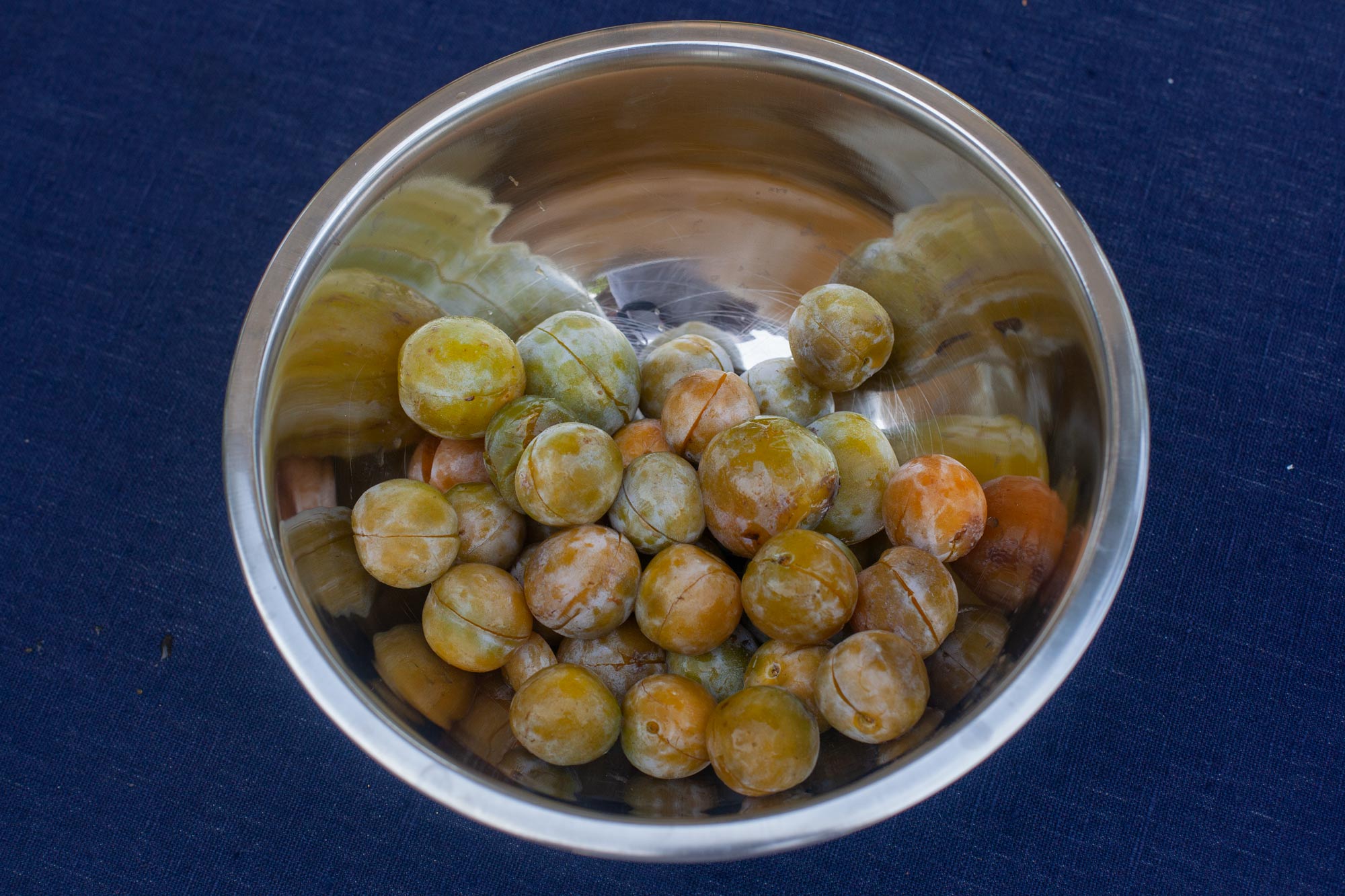 After quickly rinsing the plums in cold water, I split them in two with the dented knife, an efficient way of cutting the skin, to make stone removal easier.