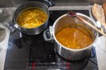 I prepared the second batch (left), one kilo with 300g added sugar and without lemon juice while the first one was cooking. After two hours on the hob on a low heat, a lot of water had evaporated from the lightly simmering first batch, now of a brownish gold colour.