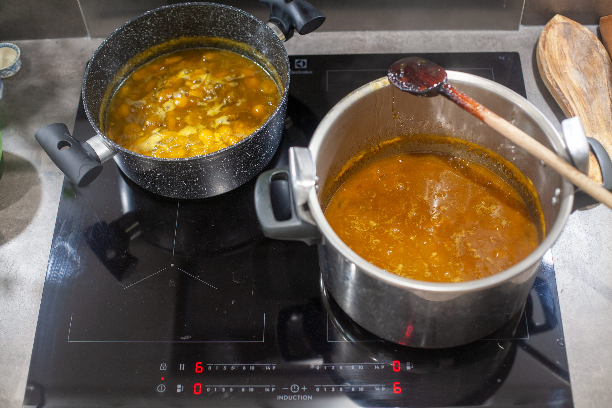 I had brought my large jam pan from Aurillac, so I had my tools. I realised I couldn’t use the pan, as it was incompatible with the induction cooking hob, but found another way. I made several batches using a smaller one I found in the house. It was even better, as I was able to test several recipes and compare the results.