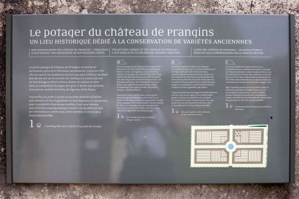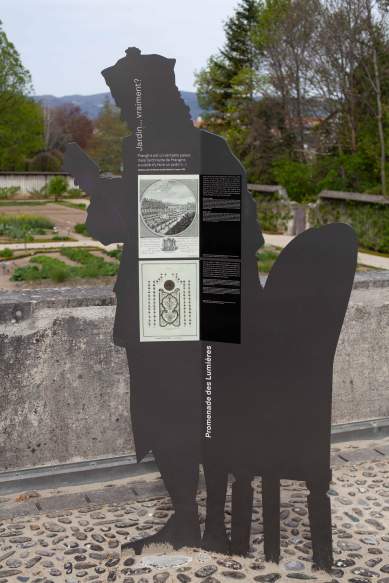 One of the double-sided information boards located around the kitchen garden on a tour called the Promenade des Lumières (Enlightenment walk). The tour enables visitors to discover the history of the castle and its 18th century protagonists, from Swiss banker Louis Guiguer to French philosopher Voltaire.