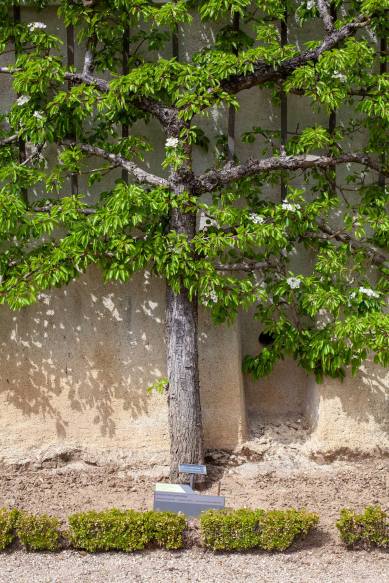 Visitors can see ripe sept-en-gueule pears on this tree early July. ‘The crops grown there are not intended for sale but rather to be exhibited in situ for as long as possible’. The label in front of the tree indicates where to listen more about the pear on the audio-guide.