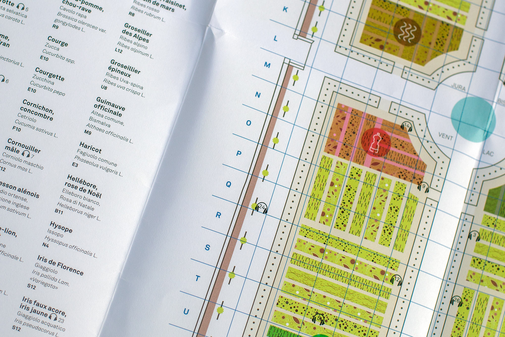 The printed map lists the plants displayed in the garden and visitors are guided towards them through a grid. This one is in French and Italian. The latin name of the plants is also provided. Photo 15 October 2019.
