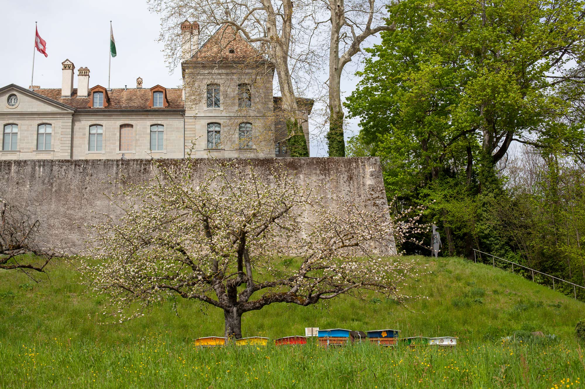 As mentioned in my 30 April article, we were advised to visit Prangin’s kitchen garden and temporary exhibition ‘A table : what does Switzerland eat?’. On the day of our visit, although very interested in Swiss culinary traditions, we focused on the kitchen garden because of time constraints. We found Prangins very promising right from the start. On the way up to the castle from the car park on the South East of the estate, bands of mown grass allowed to walk among the trees of a meadow orchard, or rather a ‘meadow-cum-orchard’, in the castle’s website words, as the fruit trees were not covering the whole surface. The field around them was growing like natural grassland. There were beehives too. As explained to visitors on an information board, the grass provides nectar and pollen to the bees and the bees pollinate the trees. The curators of his place have created a naturally flourishing biodiverse environment.
