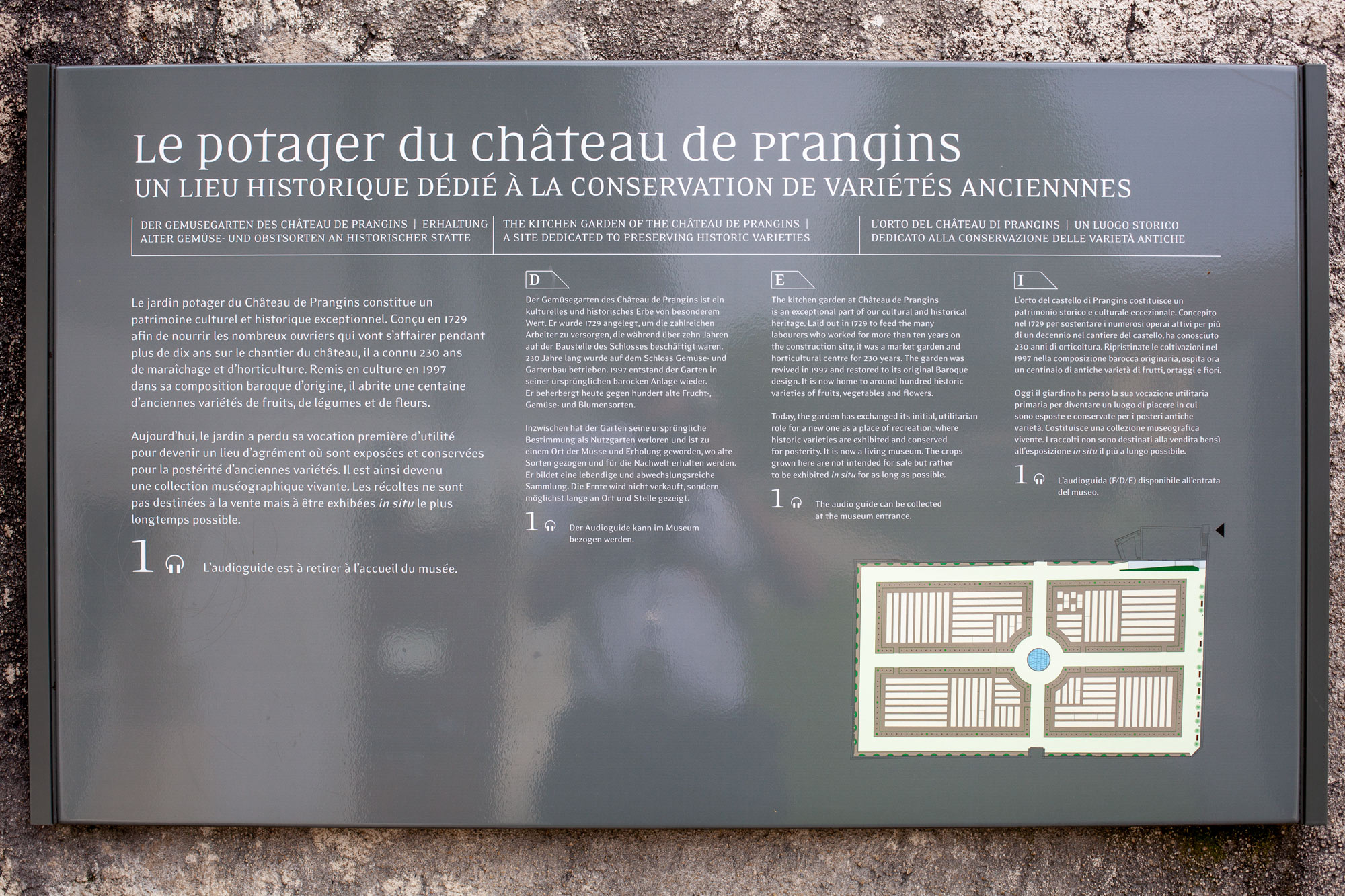 Explanations are provided in four languages on the information boards: French, German and Italian, three of the four national languages of Switzerland, and English. The kitchen garden is ‘a site dedicated to preserving historic varieties’. ‘Today, the garden has exchanged its initial, utilitarian role for a new one as a place of recreation, where historic varieties are exhibited and conserved for posterity’ (enlarge the picture to read more).