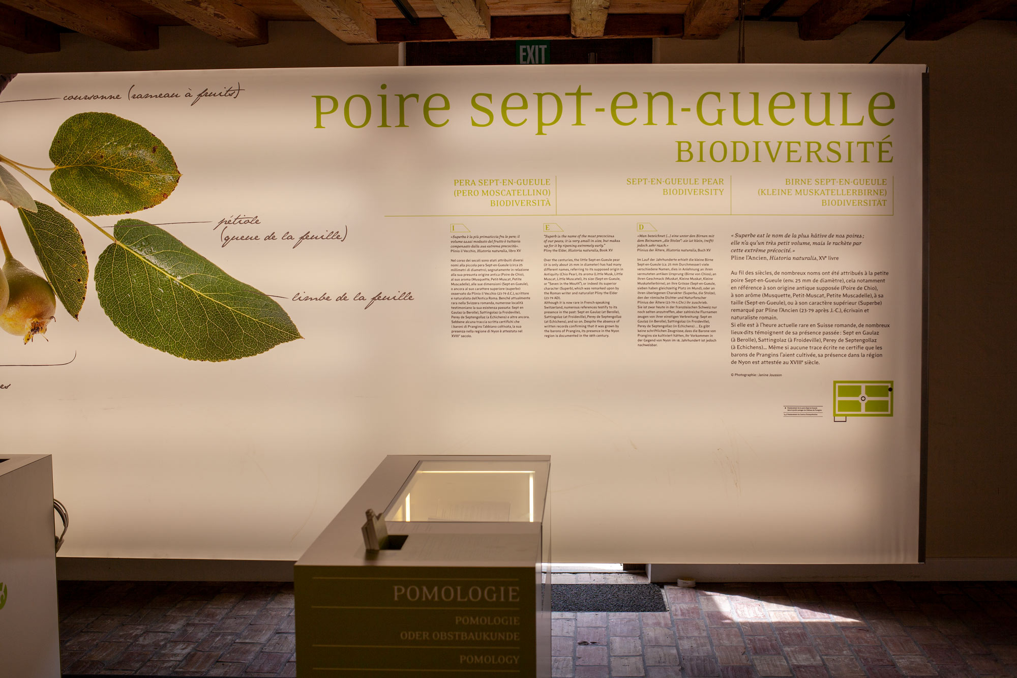 Inside the interpretation centre. The sept-en-gueule pear, very small (‘it is only about 25mm in diameter’), is one of the four emblematic plants of the collection which serve as a banner to introduce the four themes. Visitors can see, read and listen about biodiversity and the sept-en-gueule pear in the room. The small map to the bottom right of the picture indicates where the actual tree can be found in the garden.