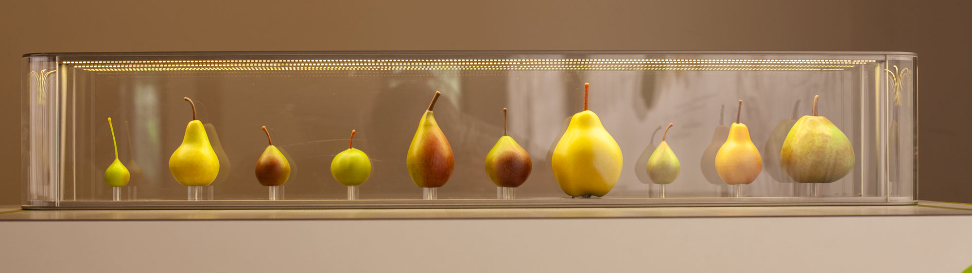The sept-en-gueule is first left in this display of diverse pears in the garden interpretation centre.