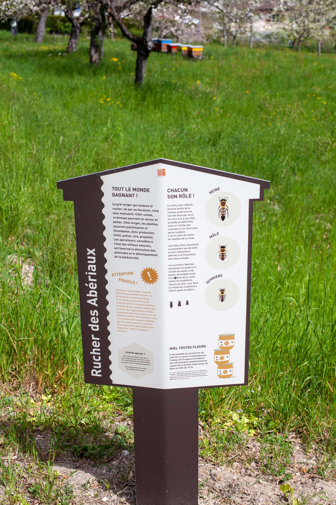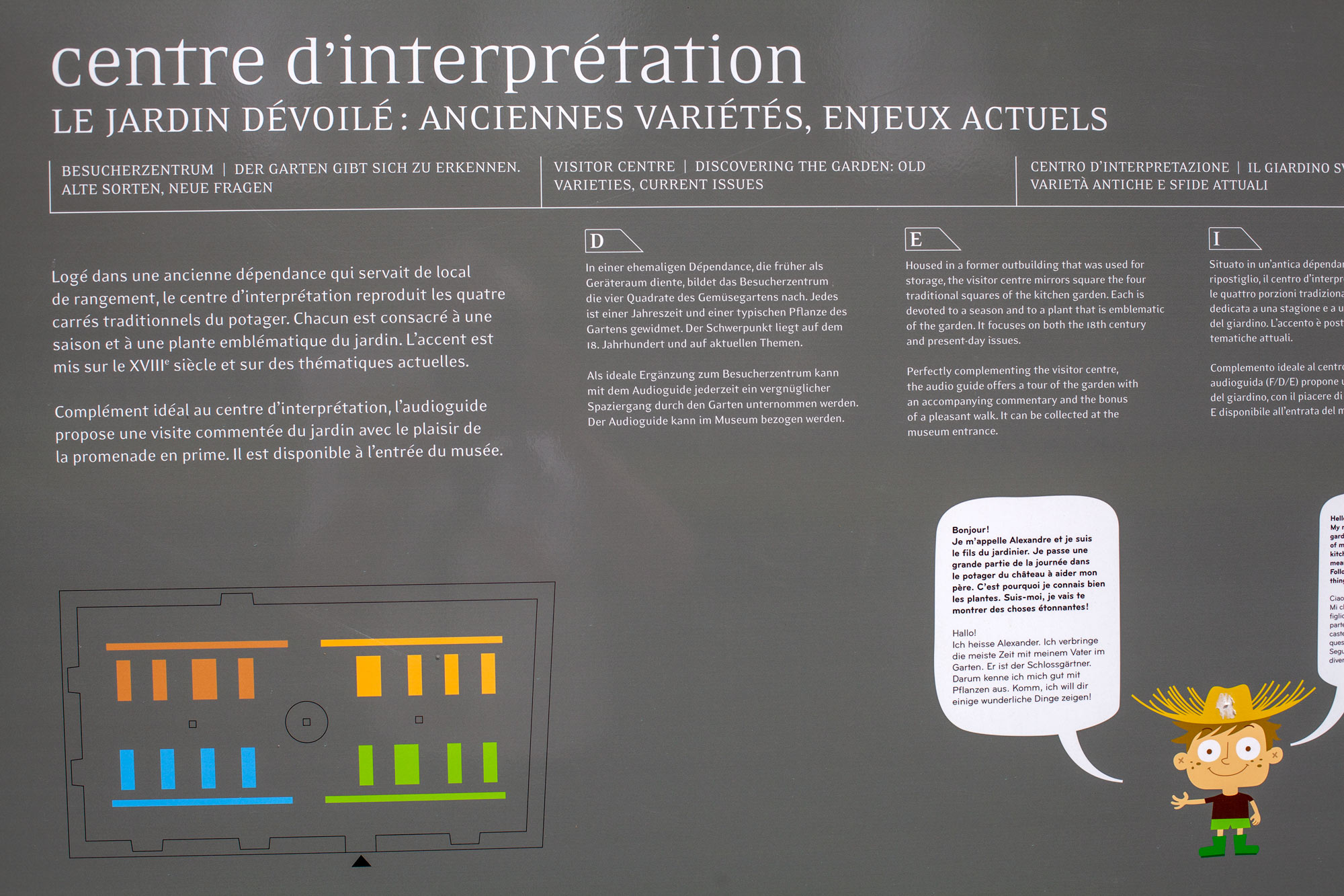 One of the double-sided information boards located around the kitchen garden on a tour called the Promenade des Lumières (Enlightenment walk). The tour enables visitors to discover the history of the castle and its 18th century protagonists, from Swiss banker Louis Guiguer to French philosopher Voltaire.