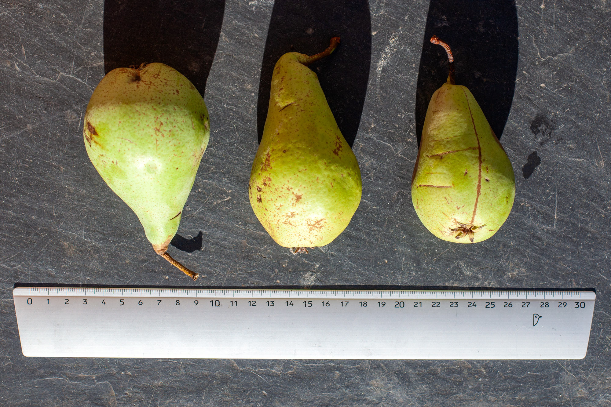 Lorsque les Croqueurs de pommes du Cantal m’ont parlé du grand poirier en 2016, ils m’ont dit qu’il était probablement de la variété Curé. La Curé est une variété ancienne de poire à cuire, commune dans les vieux vergers de France, où on la trouve sous de nombreux autres noms comme « Belle de Berry » ou « Bon Papa ». Selon André Leroy2, « La poire date de 1760 environ » (Leroy 1867, pp 610).