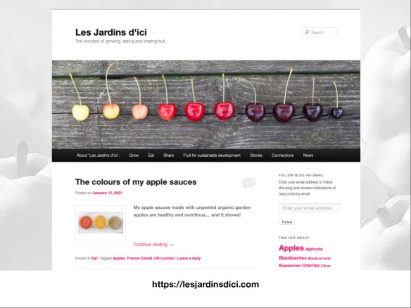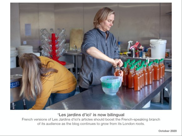 Je voulais aussi parler de mes travaux sur le terrain, par exemple cette journée de volontariat au Brighton Permaculture Trust au Royaume Uni où nous avons pasteurisé du jus de pommes; et mentionner que le blog est devenu bilingue en 2020, une évolution cohérente avec mes engagements croissants en France. (lien: article en français, idem ci-dessous).