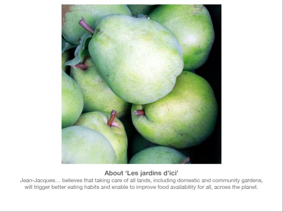 Ensuite, j’ai parlé de la genèse de mes activités. J’ai expliqué comment, après mon mastère en design à Central Saint Martins et la crise financière de 2008, j’ai revu ma vision du monde et, comme une sorte de Candide contemporain, j’ai choisi de “cultiver mon jardin”. (Cliquer sur l’image pour accéder au premier article du blog, ‘Hello fruit lovers’, publié en septembre 2013. Chacune des planches suivantes contient l’extrait d’un article et un lien vers l’article complet).