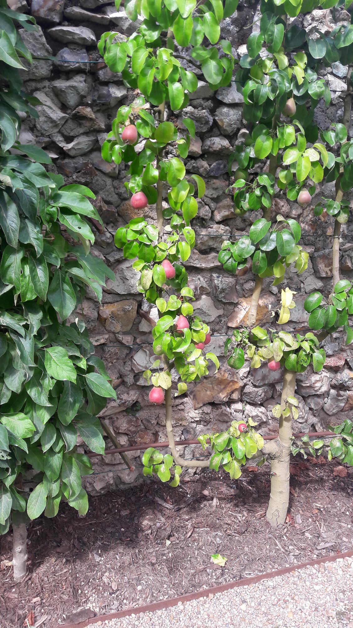 Espaliered pear trees against a breathing retaining wall