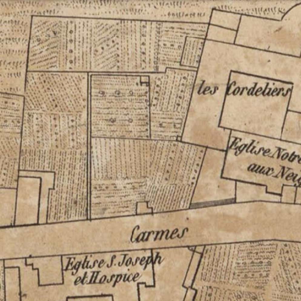 Un extrait du Plan Martin de 1812 sur lequel on voit entre autres les jardins cultivés du couvent des Cordeliers à gauche de l’église Notre Dame aux Neiges. Ces jardins ont presque tous disparu avec la croissance de la ville. Source archives municipales d’Aurillac, copie d’écran 16 mars 2023.