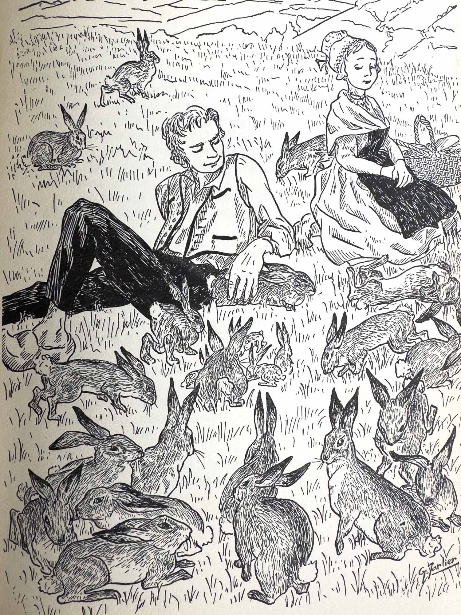A nouveau, nous nous sommes mis en scène. Ma collègue a parlé des Hackney Flashers, un collectif de femmes artistes actif dans l’est de Londres dans les années 70, en montrant un lien vers un site Internet qui décrit l’histoire de ce mouvement 3 ; quant à moi, j’ai partagé une histoire liée à ma propre expérience. Pour la raconter, j’ai utilisé quatre dessins d’un livre publié en France en 1956, un recueil de contes d’Auvergne 4.