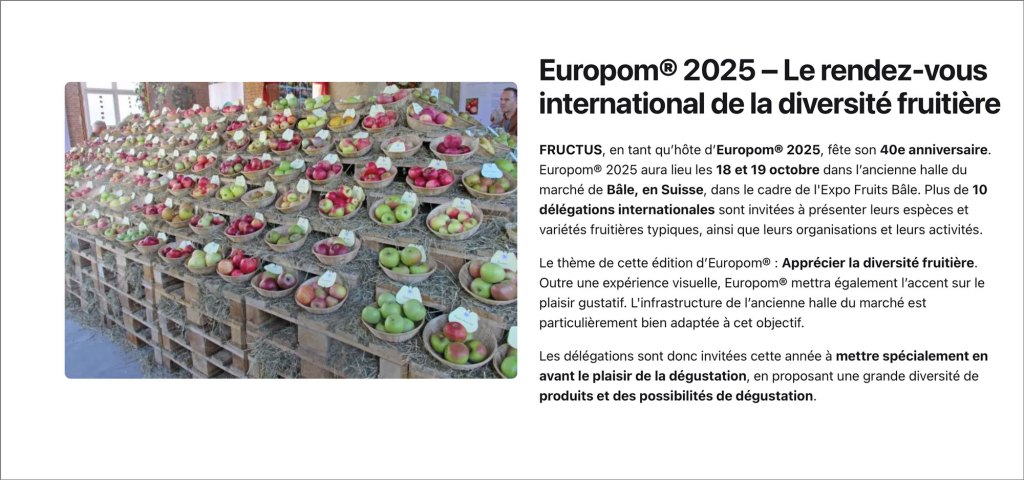 L’exposition internationale de fruits Europom® à laquelle l’Association des Croqueurs de pommes® participe chaque année s’est tenue les samedi 18 et dimanche 19 octobre 2025 à Bâle en Suisse. Elle était organisée par Fructus, le principal partenaire suisse d’Europom®, une association pour la sauvegarde du patrimoine fruitier reconnue d’utilité publique qui fête ses quarante ans. Plus de dix délégations internationales ont présenté leurs espèces et variétés fruitières typiques, ainsi que leurs organisations et leurs activités.