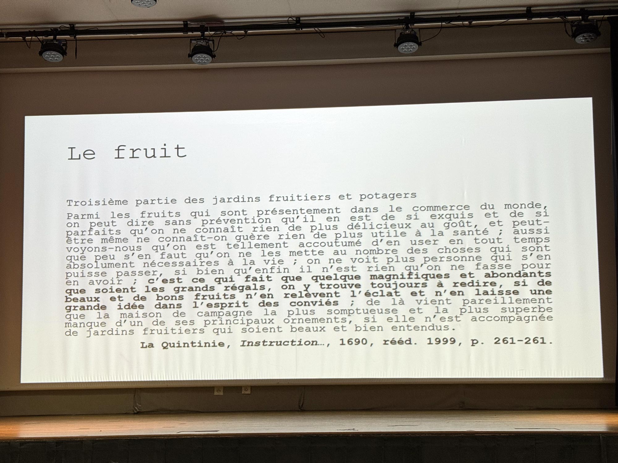 “Des salades, des petits pois et des poiriers : les potagers royaux et les repas à la française au temps de La Quintinie” (salads, green peas and pear trees: royal kitchen gardens and meals “à la française” at the time of La Quintinie) proved a hit as usual with Quellier.